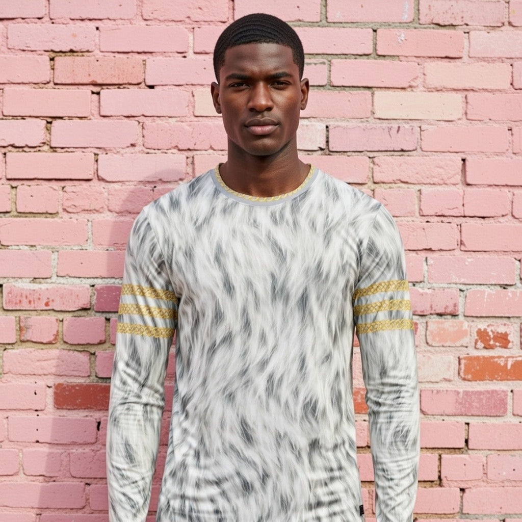 Fabled Fashion Men's Long Sleeve Snow Fur effect triple Celtic chain AOP Shirt