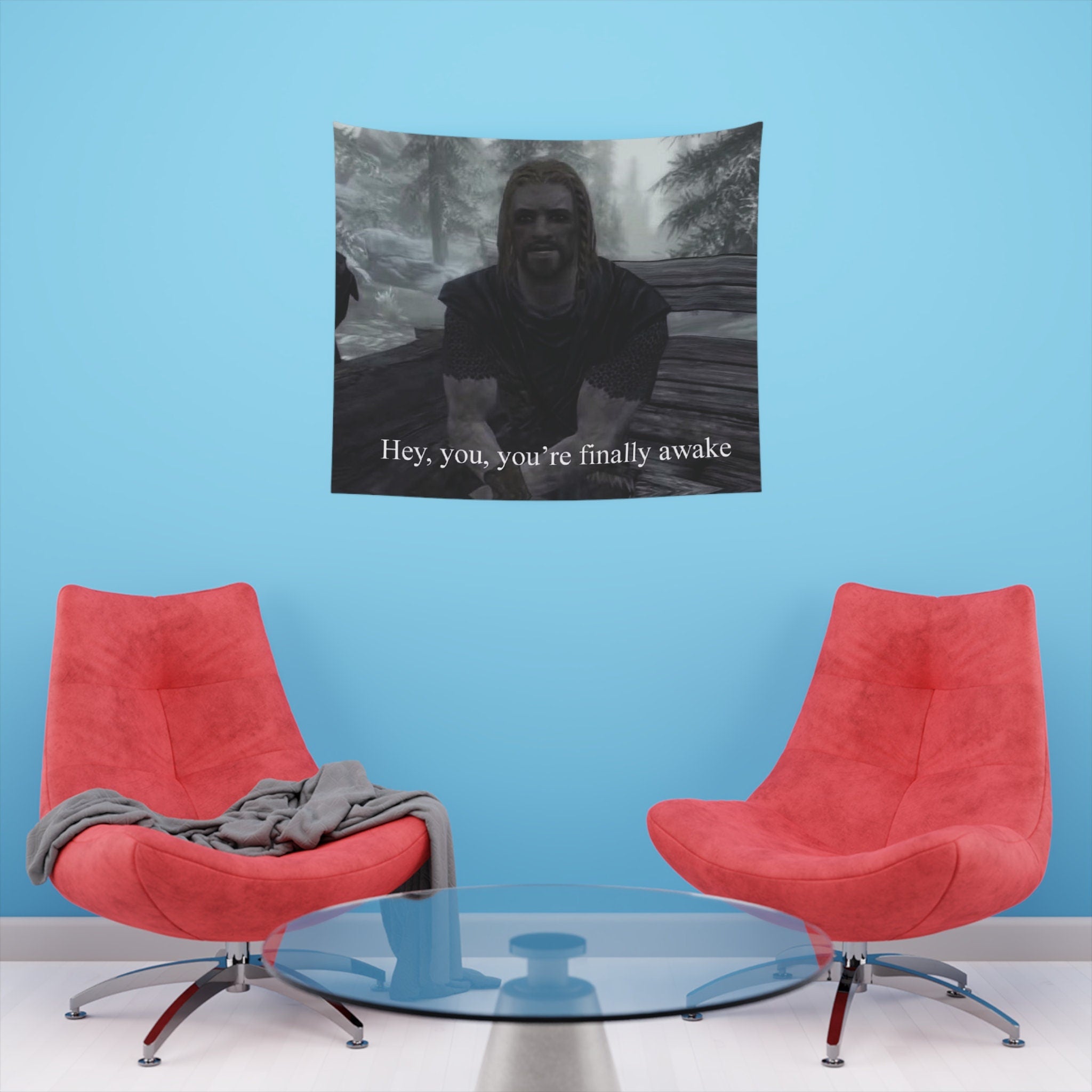 https://fabledfashion.com/products/skyrim-inspired-iconic-hey-youre-awake-printed-wall-tapestry